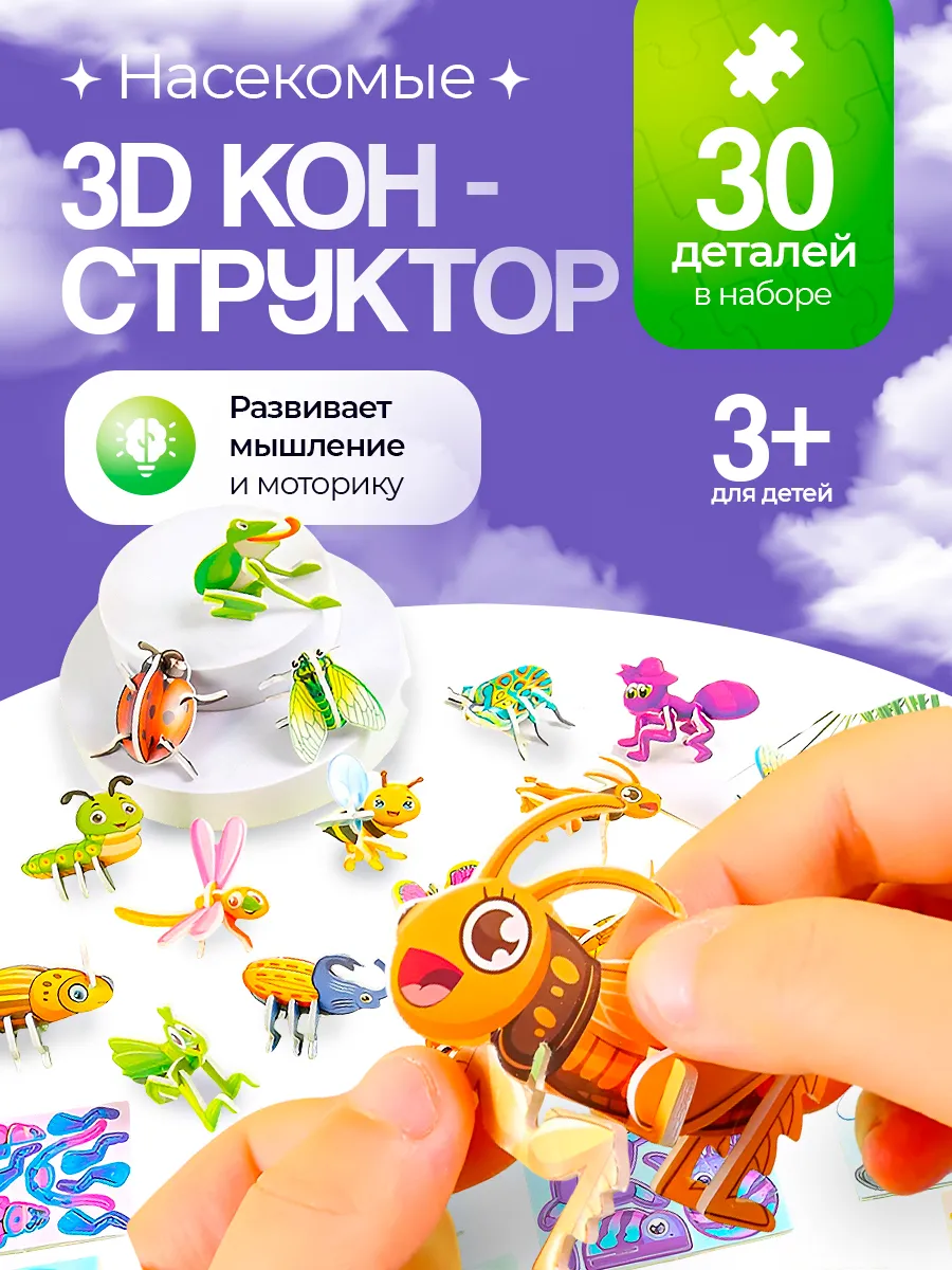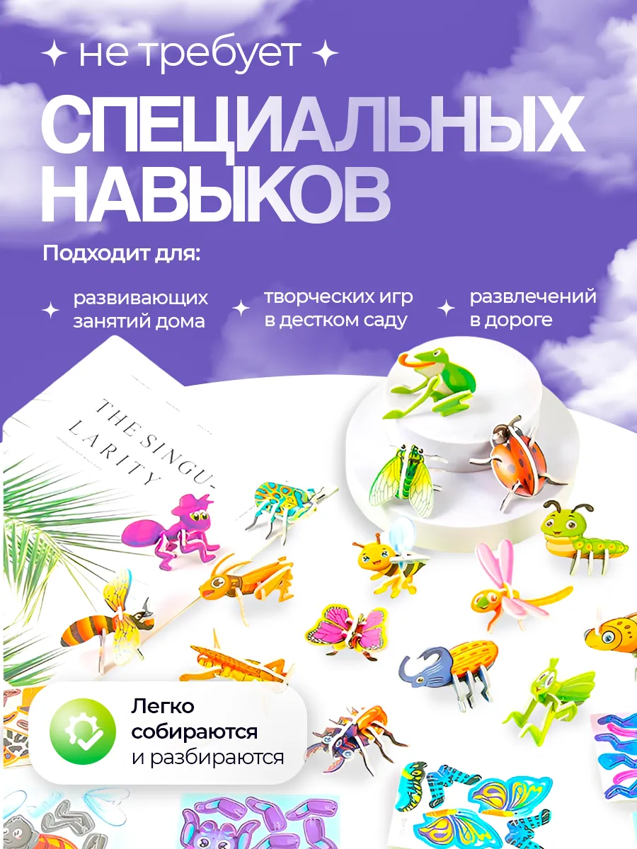 3D-конструктор «Насекомые» — увлекательный набор для творчества и сборки объемных фигурок своими руками. Такой формат особенно понравится детям, которым интересен мир насекомых, жуков, бабочек и других маленьких обитателей природы. Набор подходит для занятий дома, в детском саду, в дороге и в поездке. Во время сборки ребенок развивает внимание, усидчивость, аккуратность, мелкую моторику и воображение. Набор станет как самостоятельным подарком для полезного досуга, просто приятным сюрпризом, так и дополнением к готовому подарку.