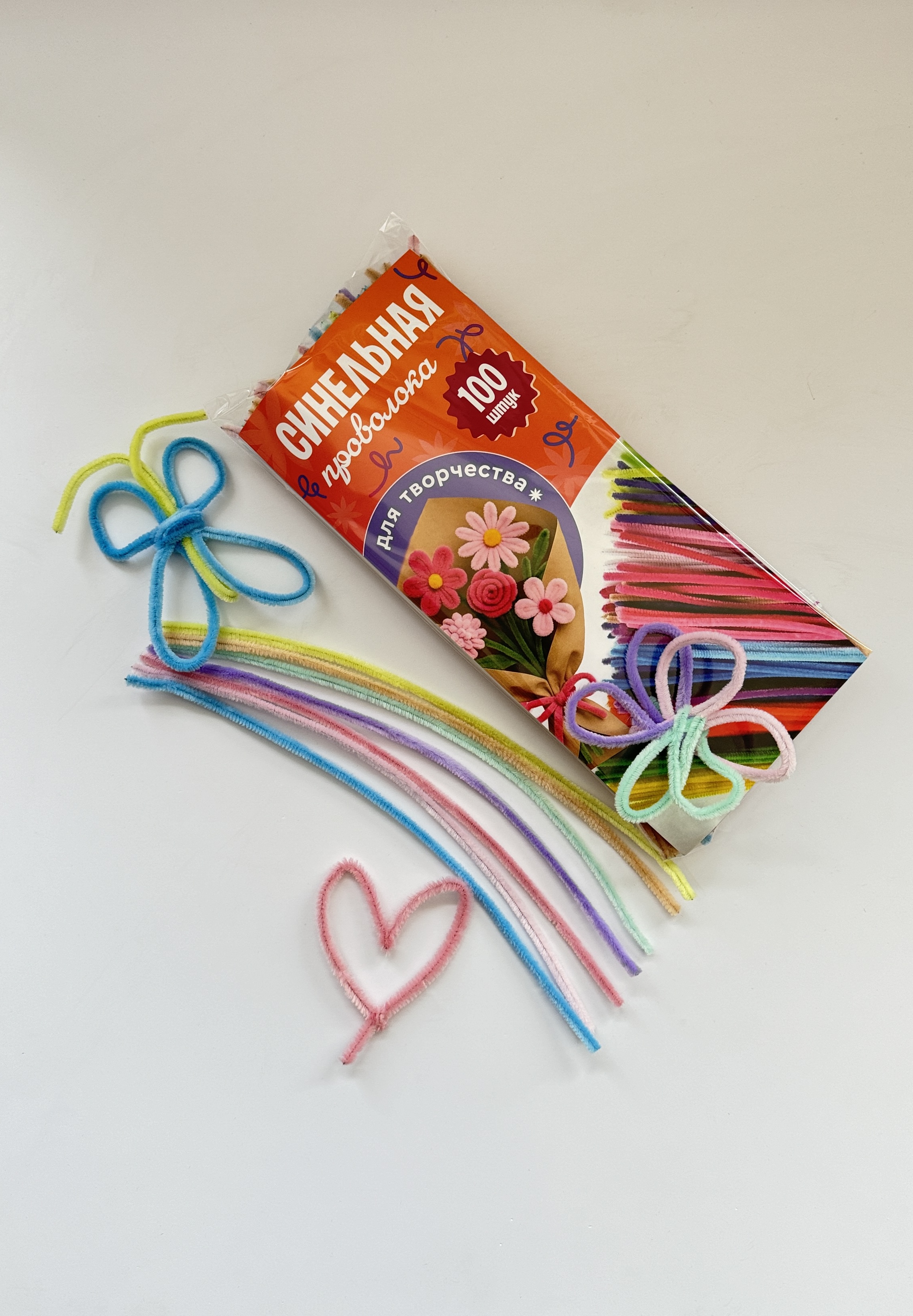 0001 Синельная проволока для творчества в наборе из 100 штук. Мягкая, гибкая и удобная в работе, подходит для поделок, аппликаций, декора и детского творчества. В наборе 10 различных цветов.