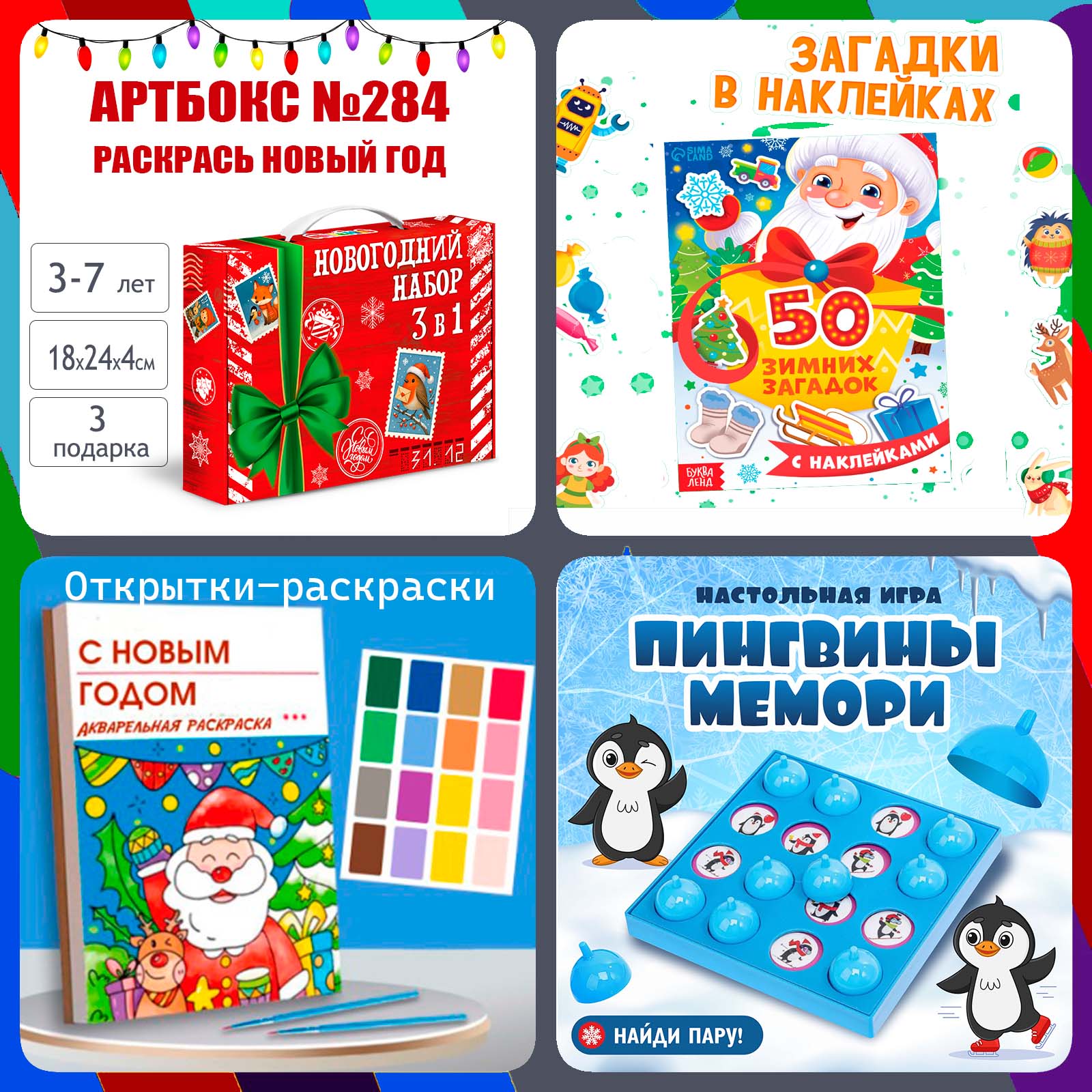 Артбокс №284 "Раскрась Новый год" (3-7 лет) из 3 подарков. Отличное решение для подарков в детском саду от родительского комитета. Подарок подходит как мальчикам, так и девочкам.