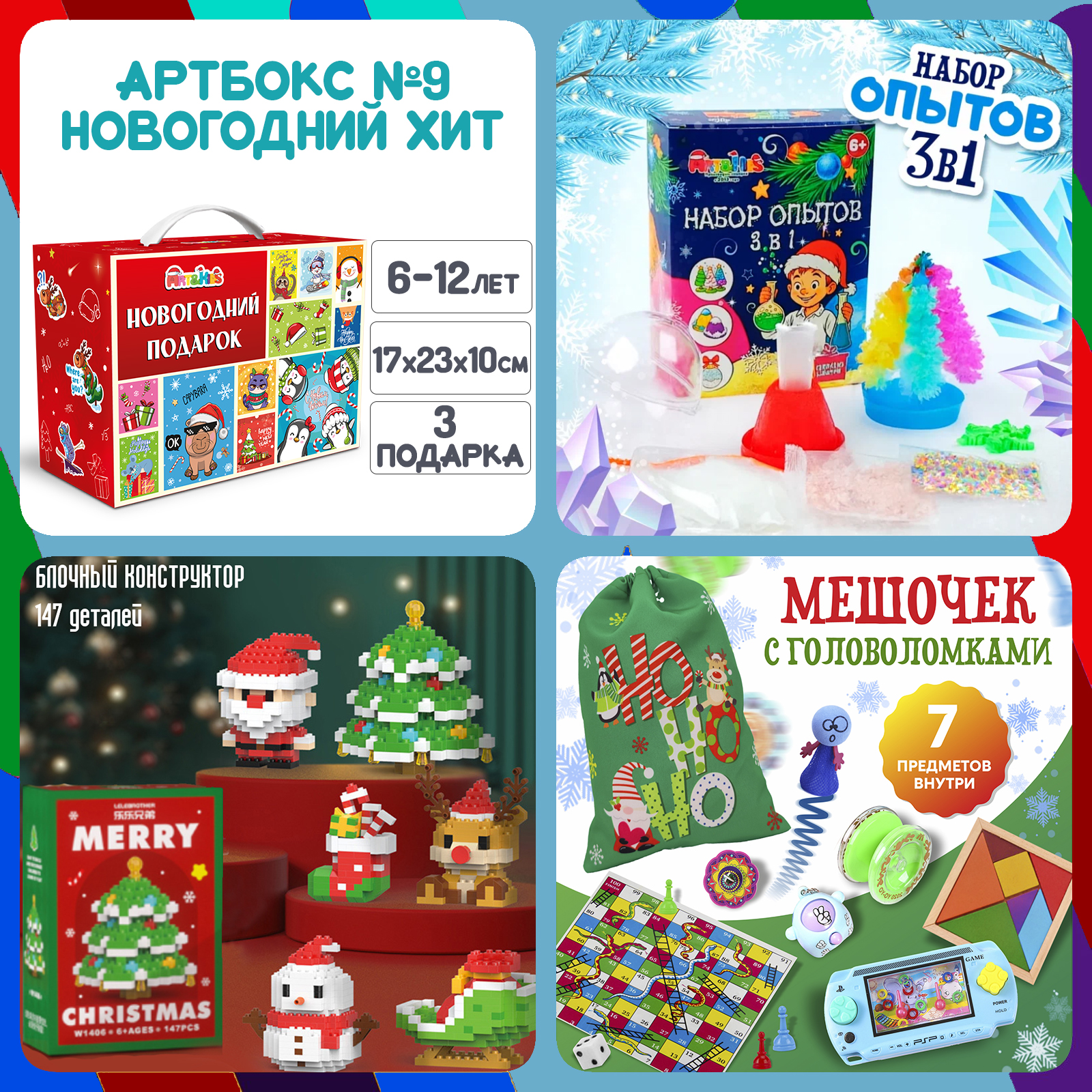 Артбокс №09 "Новогоднее счастье" (7-16 лет) из 3 подарков. Детям любого школьного возраста будет интересно самостоятельно сделать опыты, собрать новогодний конструктор-трансформер и "поломать голову над головоломкой"
