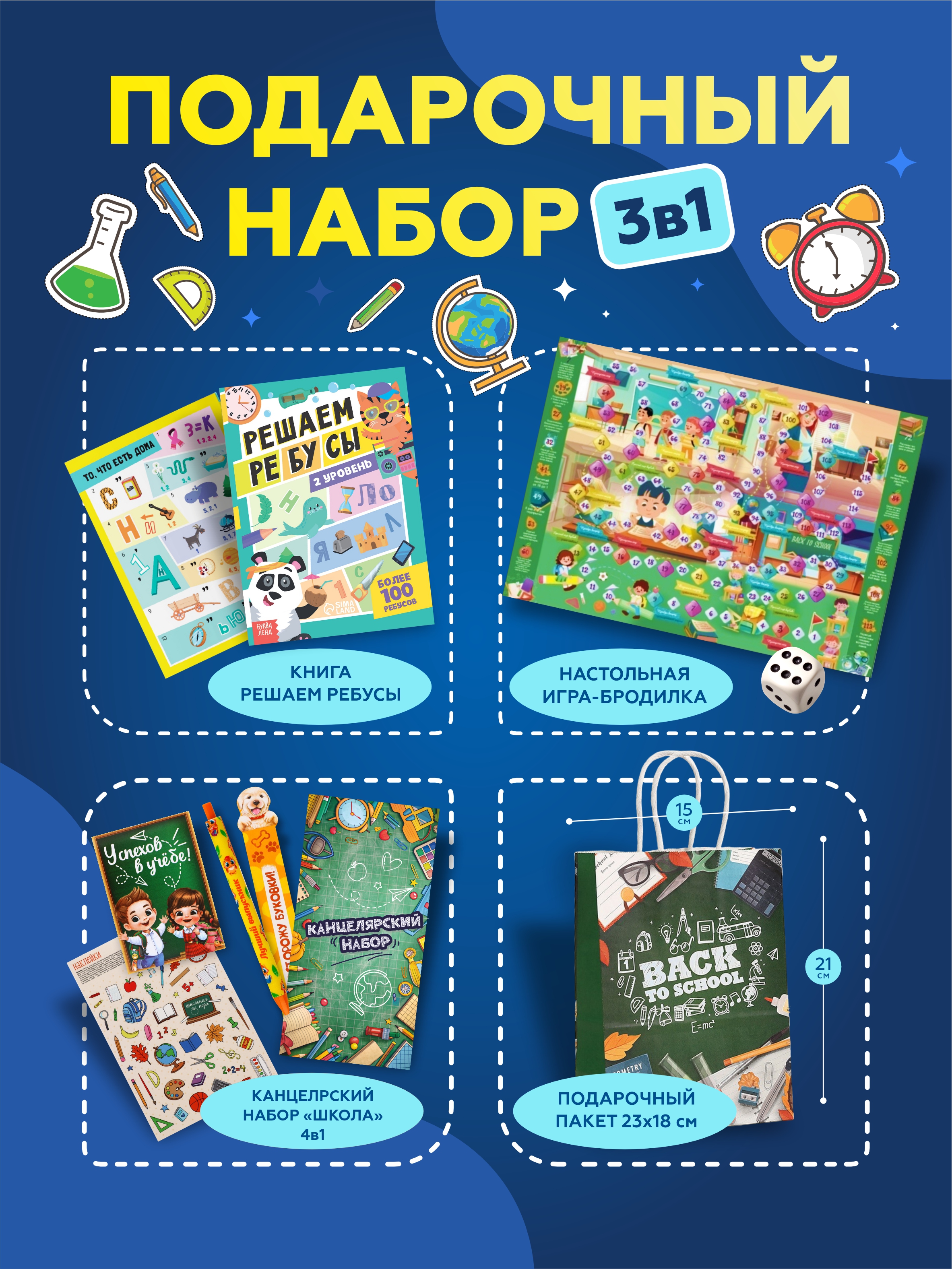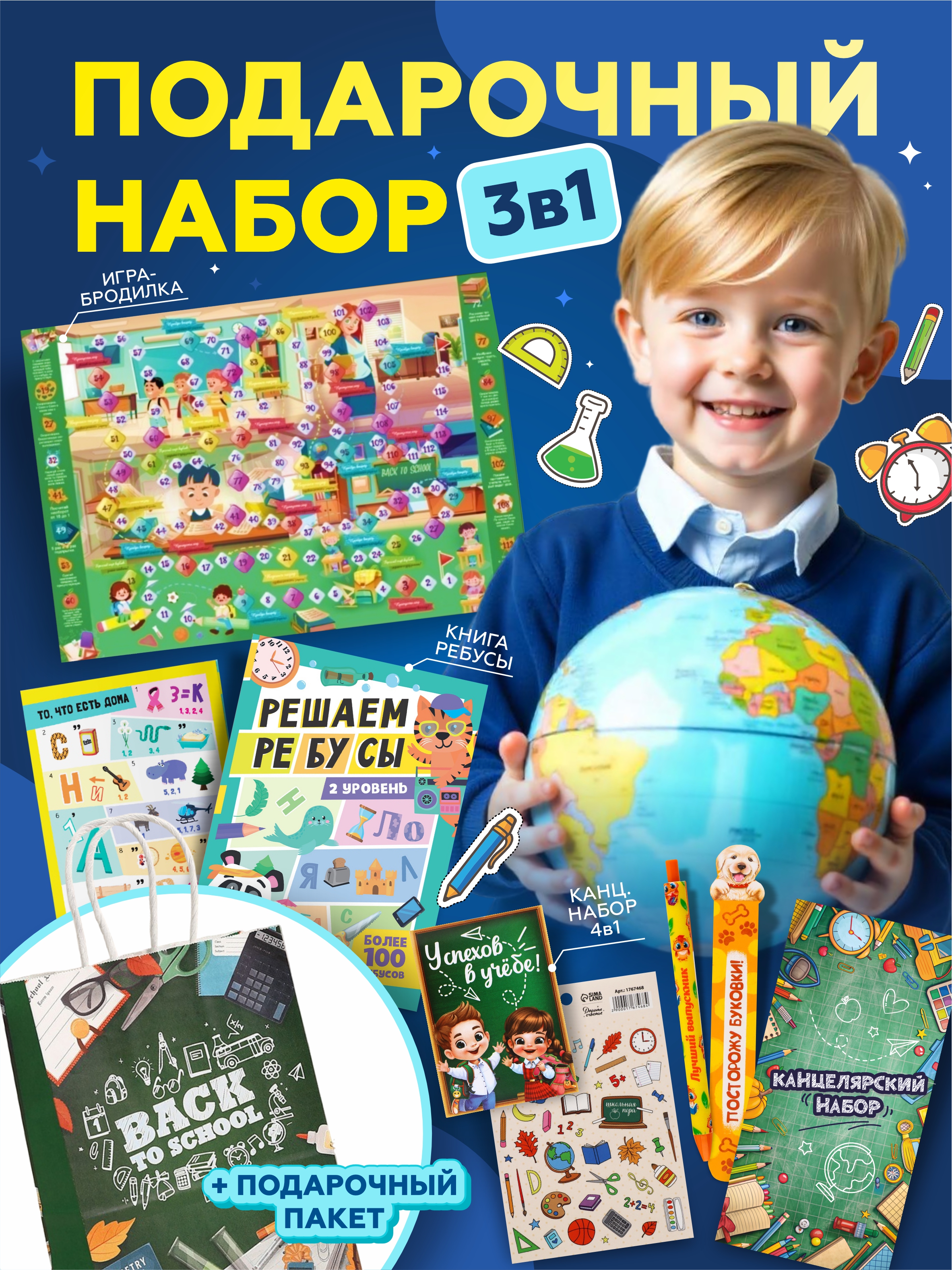 Подарочный набор 3 в 1 для выпускного в детском саду и первоклассника — готовый подарок детям, который удобно вручать всей группе. Подходит как подарок на выпускной в детский сад, подарок первокласснику, набор первоклассника и мини подарок детям. В комплекте полезное и интересное наполнение: игра-бродилка, книга с ребусами, канцелярский набор и подарочный пакет. Такой детский подарочный набор помогает порадовать ребёнка, занять его игрой и подготовить к школе. Отличный вариант для родителей, воспитателей и организаторов, которым нужны подарки детям в детский сад, подарки на выпускной детям, подарки в садик оптом, подарки для группы детей и подарки детям на 1 сентября. Готовое решение без лишних хлопот — красиво, полезно и сразу можно дарить.