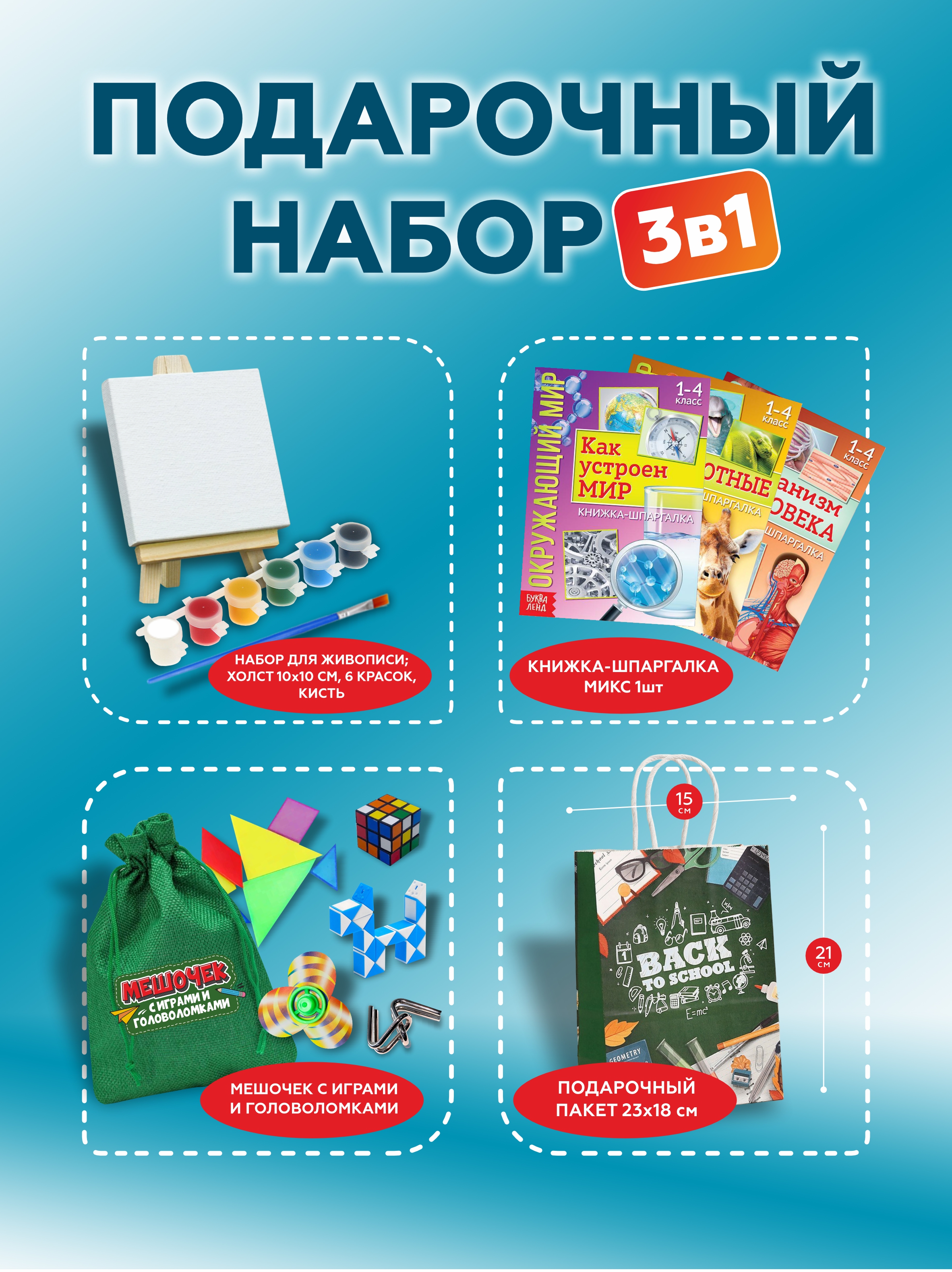 Набор для рисования помогает развивать воображение, мелкую моторику, аккуратность и интерес к творчеству. Книжка-шпаргалка для детей делает подарок не только интересным, но и полезным, помогает узнавать новое и расширять кругозор. Мешочек с играми и головоломками добавляет эмоции, увлекательный досуг и разнообразие. Подарочный пакет делает вручение аккуратным и праздничным.