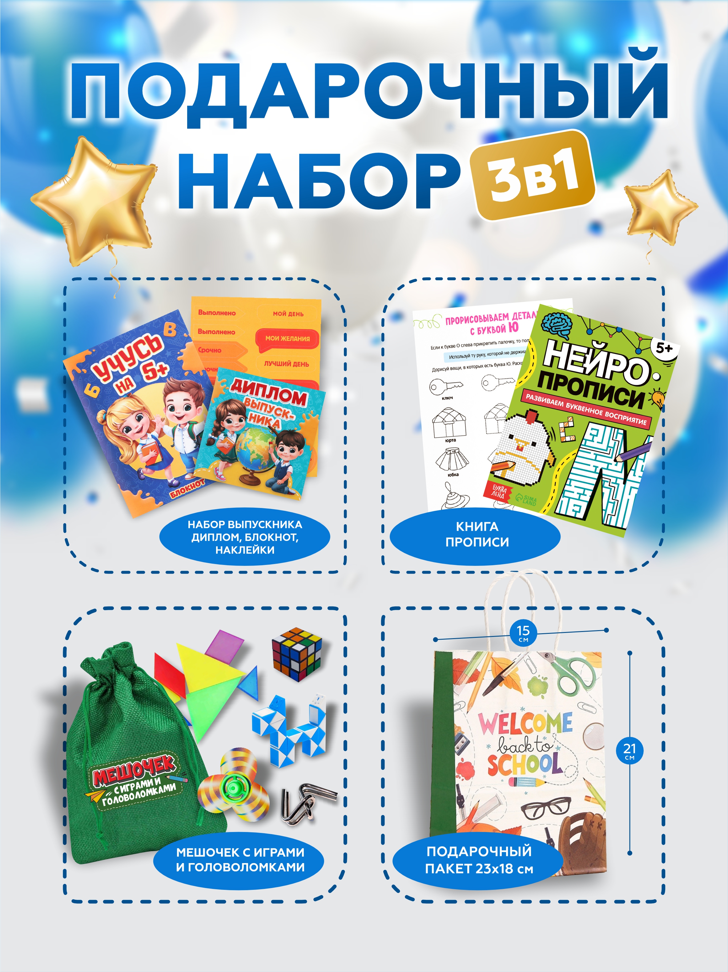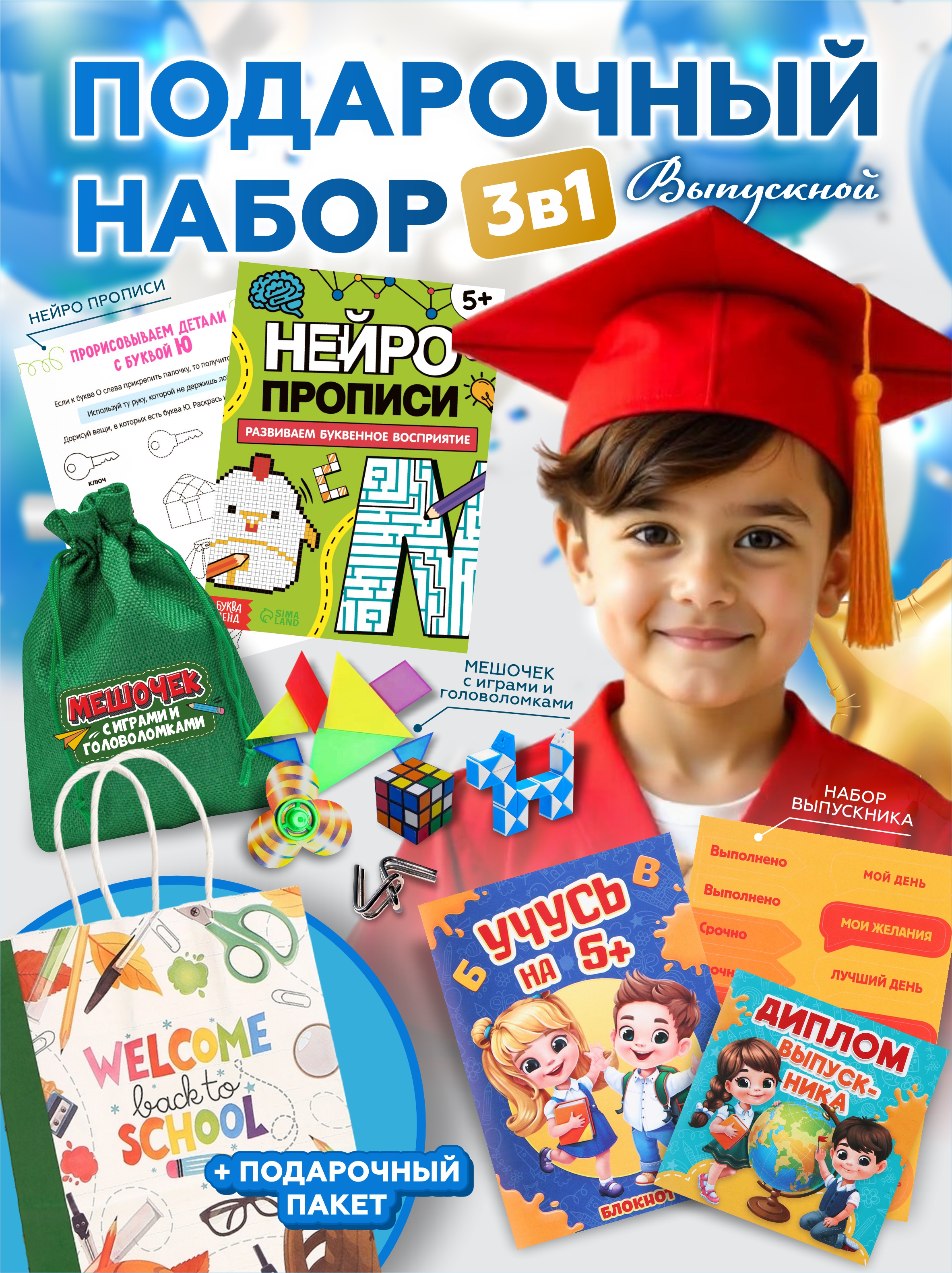 готовый подарок 3 в 1, универсален для детей 5–7 лет, подходит для мальчиков и девочек, сочетает развивающие материалы и игры, красиво оформлен, подходит для выпускного в детском саду.