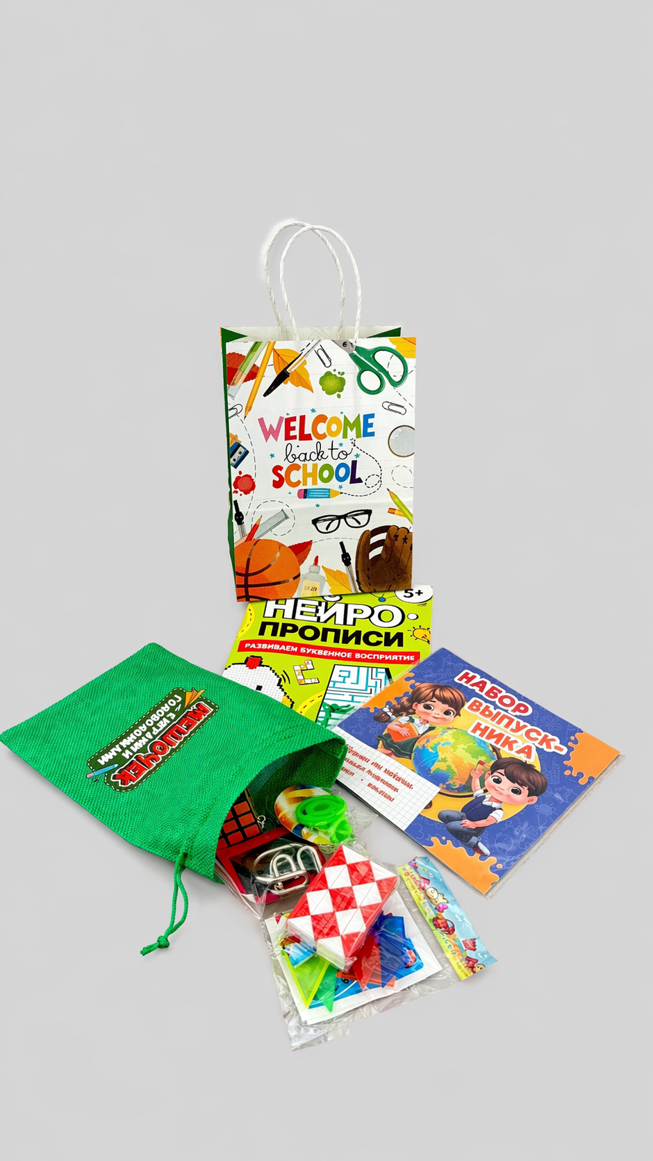 В набор входит все, что делает подарок по-настоящему интересным и наполненным: диплом выпускника, блокнот, наклейки, книга-прописи, мешочек с играми и головоломками, подарочный пакет. Это не просто сувенир, а детский подарочный набор, который можно использовать для игр, занятий и как памятный подарок на выпускной.