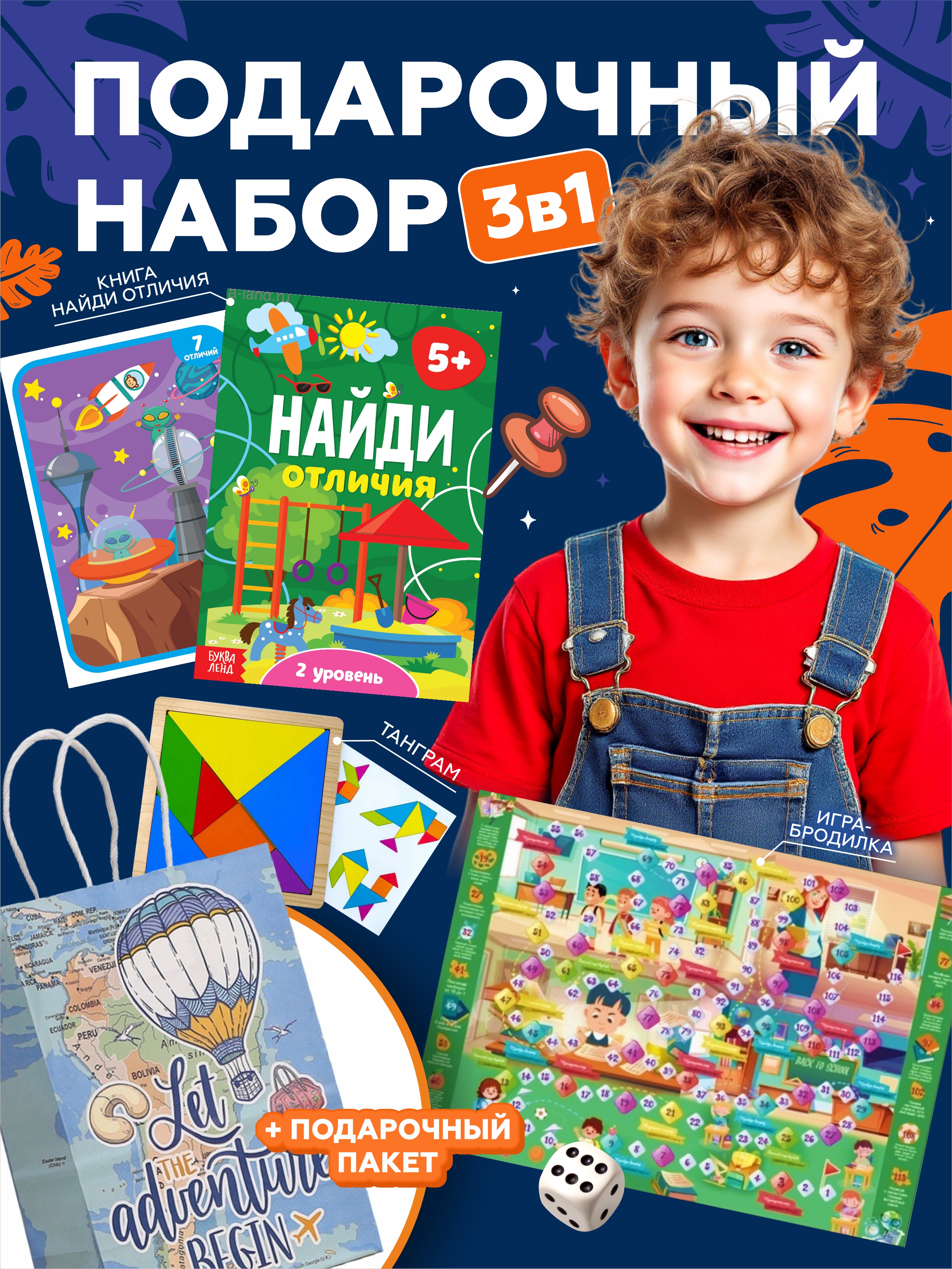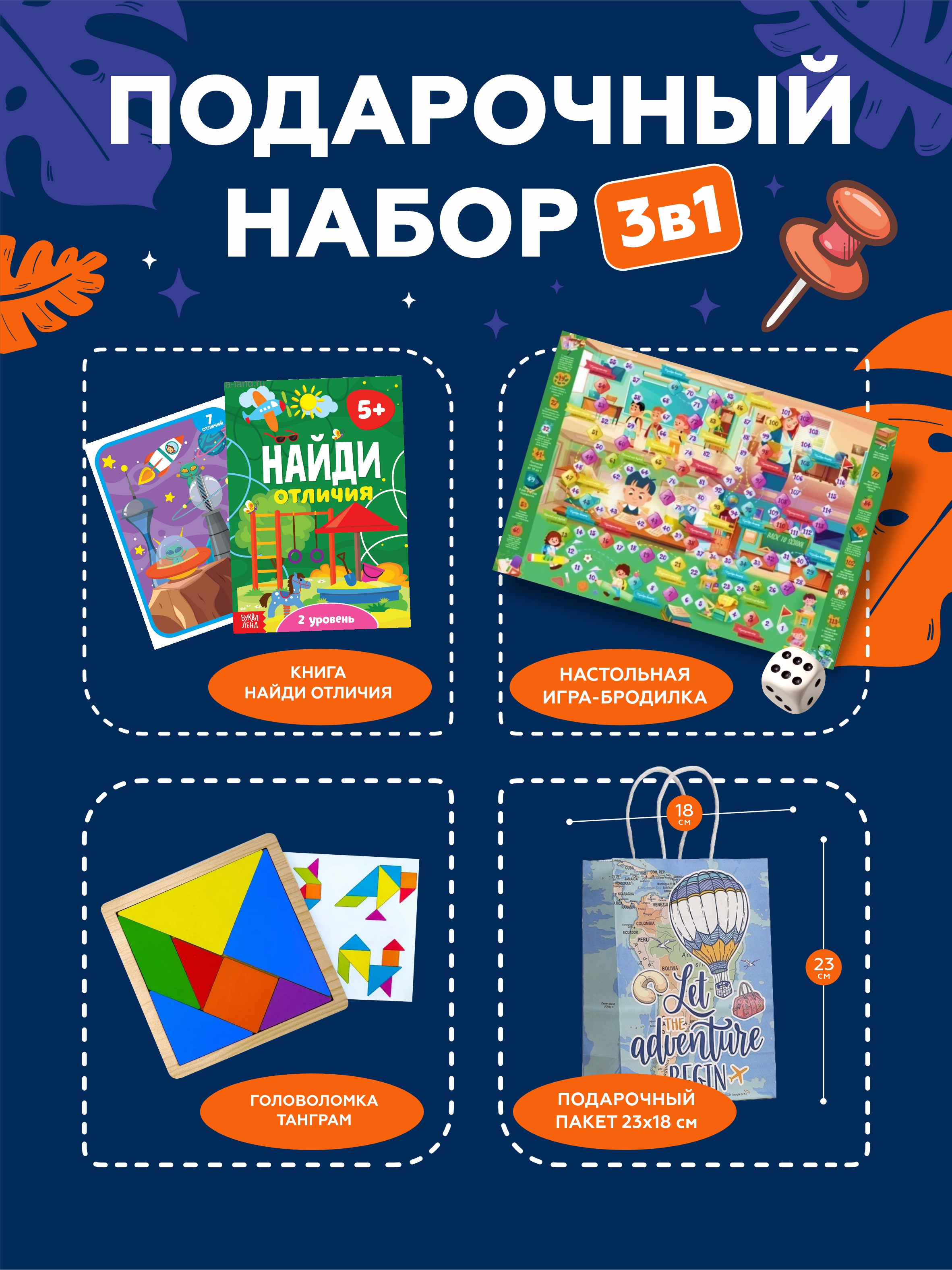 Книга найди отличия помогает развивать внимание, усидчивость, наблюдательность и логическое мышление. Настольная игра-бродилка делает набор еще более увлекательным и подходит для веселого досуга дома, с друзьями и всей семьей. Танграм для детей развивает воображение, пространственное мышление, логику и мелкую моторику. Подарочный пакет делает вручение аккуратным и праздничным.
