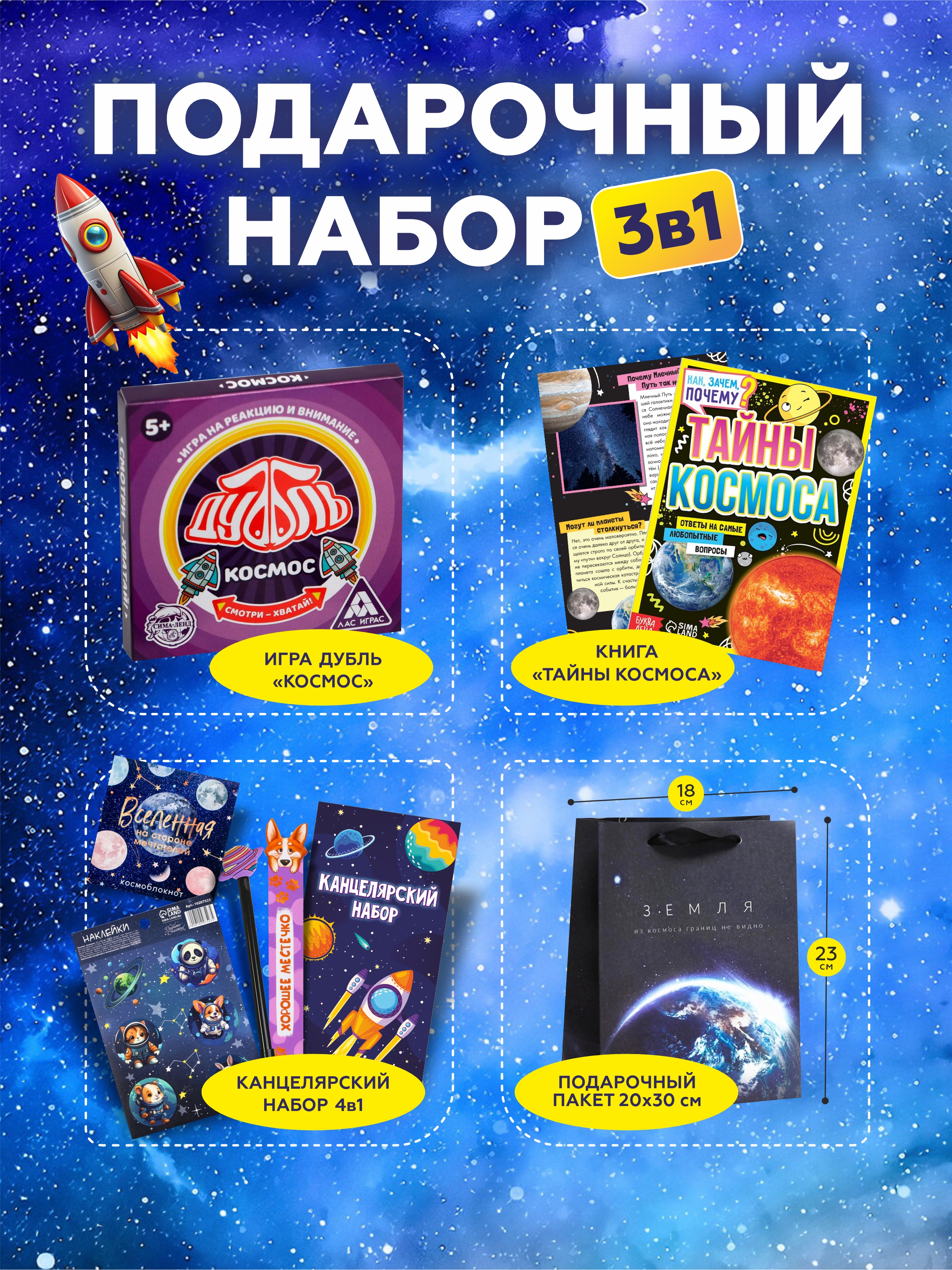 В набор входит все, что делает подарок интересным и запоминающимся: игра дубль “Космос”, книга “Тайны космоса”, канцелярский набор 4 в 1 и подарочный пакет. Это не просто сувенир, а детский подарочный набор, который можно подарить ребенку на день рождения, праздник, выпускной, 1 сентября, Новый год или просто как приятный тематический сюрприз.