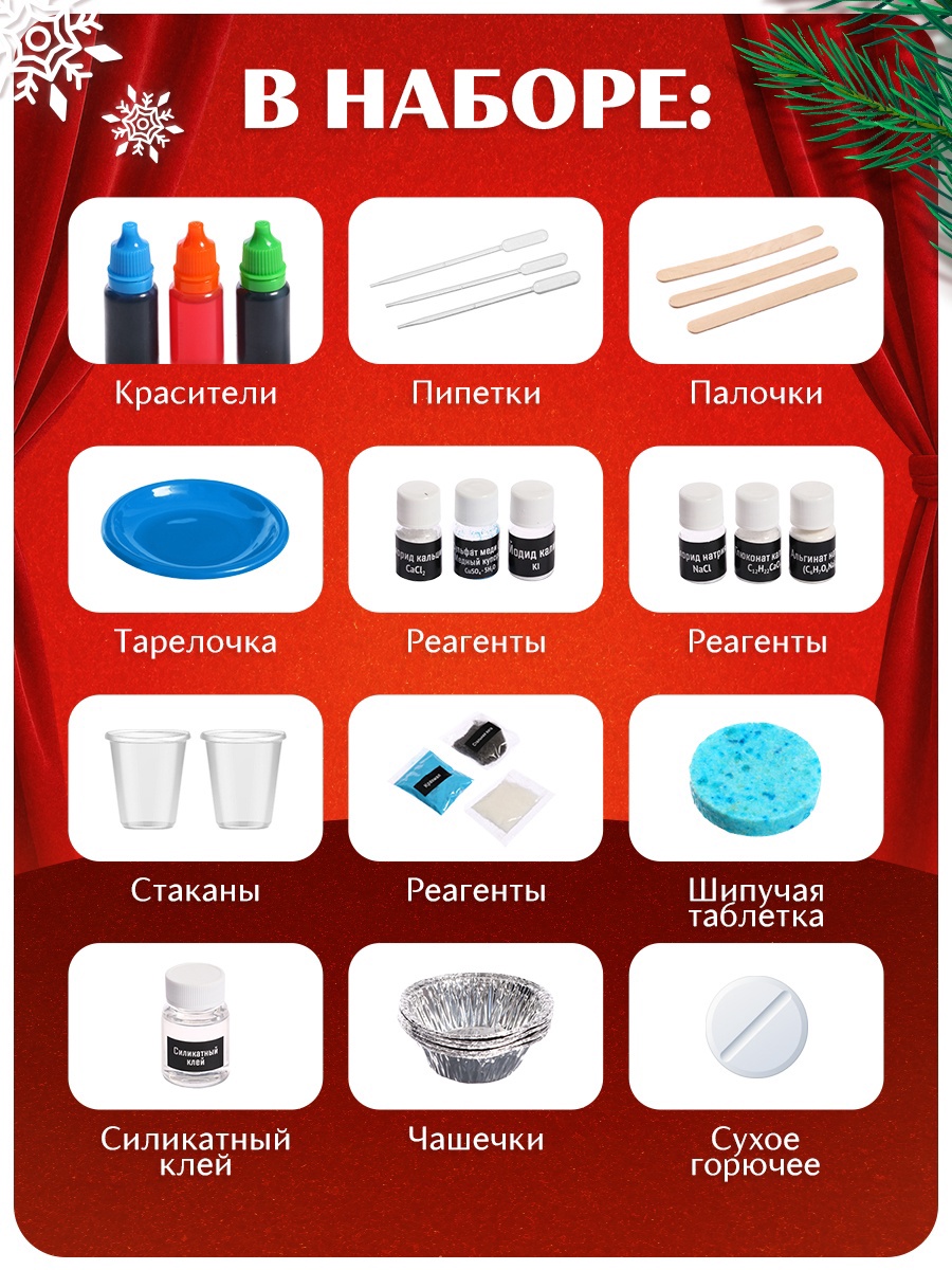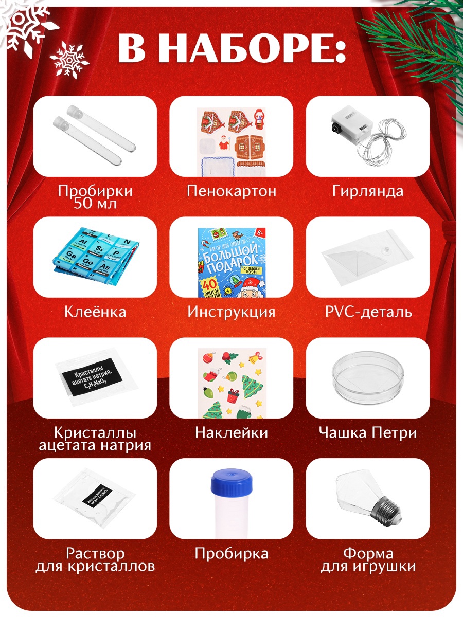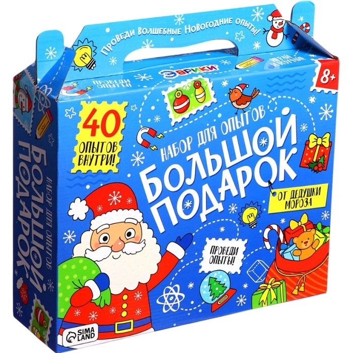 С набором для опытов «Большой новогодний подарок» — то, что нужно для полезного и интересного досуга! Такой подарок поможет ребёнку скрасить ожидание Нового года, а также позволит провести целых 40 увлекательных опытов!